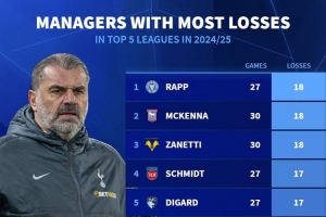 本賽季五大聯(lián)賽教練失利場次排名(僅統(tǒng)計聯(lián)賽):