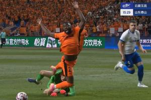 體育資訊05月05日訊 泰山vs玉昆比賽第15分鐘,于金永禁區(qū)內(nèi)撲倒奧斯卡,邊裁示意越位在先!
