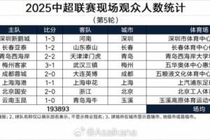 2025中超聯(lián)賽第5輪所有比賽現(xiàn)場觀眾人數(shù)統(tǒng)計如下(主隊在前):