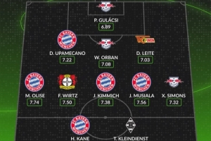 中場:奧利塞(拜仁,7.74分)、維爾茨(勒沃庫森,7.50分)、基米希(拜仁,7.38分)、穆西亞拉(拜仁,7.56分)、哈維-西蒙斯(萊比錫,7.32分)