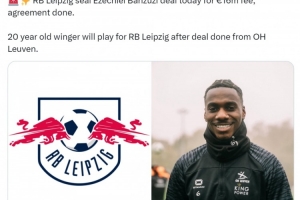 羅馬諾指出,萊比錫對效力于比利時俱樂部奧哈瓦里的班祖齊感興趣,并已經(jīng)就球員的轉(zhuǎn)會交易達成協(xié)議,轉(zhuǎn)會費1600萬歐元。交易完成之后,班祖齊將為萊比錫俱樂部效力。