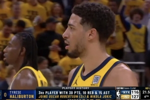 據(jù)統(tǒng)計,哈利伯頓成為季后賽歷史上第三位砍下至少30分10板15助攻的球員,比肩大O(2次)、約基奇。