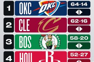 1-5:雷霆(上期第1)、騎士(2)、凱爾特人(3)、火箭(4)、勇士(5);