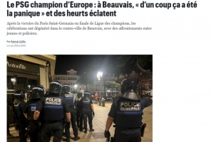 在歐冠決賽中,巴黎圣日耳曼5-0大勝國米,成功奪冠。巴黎圣日耳曼的球迷們在法國各地慶祝,但在博韋卻發(fā)生了球迷騷亂。當(dāng)時(shí)一群球迷先是歡呼奪冠,然后開始侮辱馬賽人,并來到阿歇特廣場。而在拉法耶百貨附近,有大約20名防暴警察拿著盾牌維持秩序,之后局勢突然變得緊張。