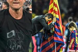 恩里克T恤上的卡通圖案是2015年巴薩奪得歐冠時(shí),恩里克與女兒插旗的名場(chǎng)面,只不過旗子換成了巴黎隊(duì)徽。