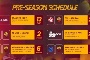 隨后,羅馬將前往英格蘭,于8月2日至8日在伯頓特倫特河畔的圣喬治公園進(jìn)行集訓(xùn)。在這段訓(xùn)練期間,已安排一場(chǎng)對(duì)陣維拉的熱身賽,比賽定于8月6日在沃爾索爾的貝斯科特球場(chǎng)舉行。