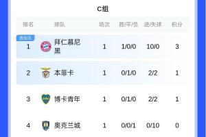 拜仁3分領(lǐng)跑C組,本菲卡、博卡分列二三名,奧克蘭城墊底。