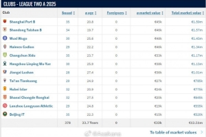 俱樂部總身價方面,上海海港B隊以159萬歐元排名第一,山東泰山B隊以157萬歐元排名第二,廣西恒宸以146萬歐元排名第三,無錫吳鉤以143萬歐元排名第四。